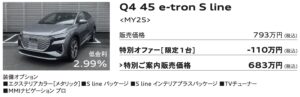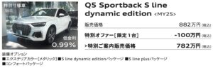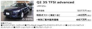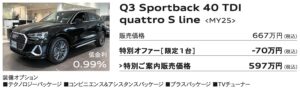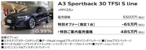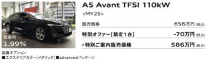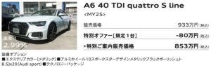 ■ 掲載車は本サイト記載のAudi正規ディーラーにて2025年12月末日までの登録が条件となります。売切れの場合はご容赦ください。■販売価格は2025年11月現在の車両本体価格(消費税10%込み)に、表示のオプション価格(消費税10%込み)をプラスしたものです。標準工具一式は含まれていますが、記載のオプション以外の付属品価格、保険料、税金(消費税を除く)、登録に伴う諸費用等は含まれておりません。リサイクル料金が別途必要となります。■低金利・ご購入サポート対象条件:Sローン、Audi Future Drive、オープンエンドリース、ファーストプランをご利用(36回まで)。2025年11月以降 のご注文およびご登録が対象となります。他のプランやご購入条件、登録時期、モデル・グレード等により別の金利が適用される場合がございます。他のキャンペーンとの併用はできません。本キャンペーンは予告なく変更・終了する場合がございます。ローン提携会社:アウディファイナンシャル サービス。詳しい内容は、本サイト記載のAudi正規ディーラーまでご確認ください。■掲載写真のボディカラー、シートカラーはご覧になるデバイスの性質上、実際の色とは異なって見える場合があります。■記載の仕様・装備・諸元・価格は予告なく変更される場合があります。■掲載の装備は、カタログ掲載の装備、 オプション装備内容とは一部異なる場合があります。■詳細につきましては本サイト記載のAudi 正規ディーラーまでお問合せください。